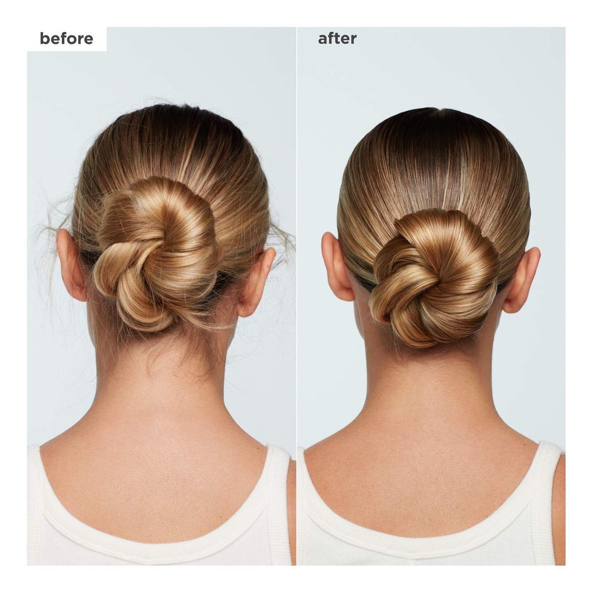 Una barra de peinado que alisa el cabello hacia atrás para lograr una coleta perfecta o un peinado recogido con un acabado sin encrespamiento y una fijación de 24 horas.