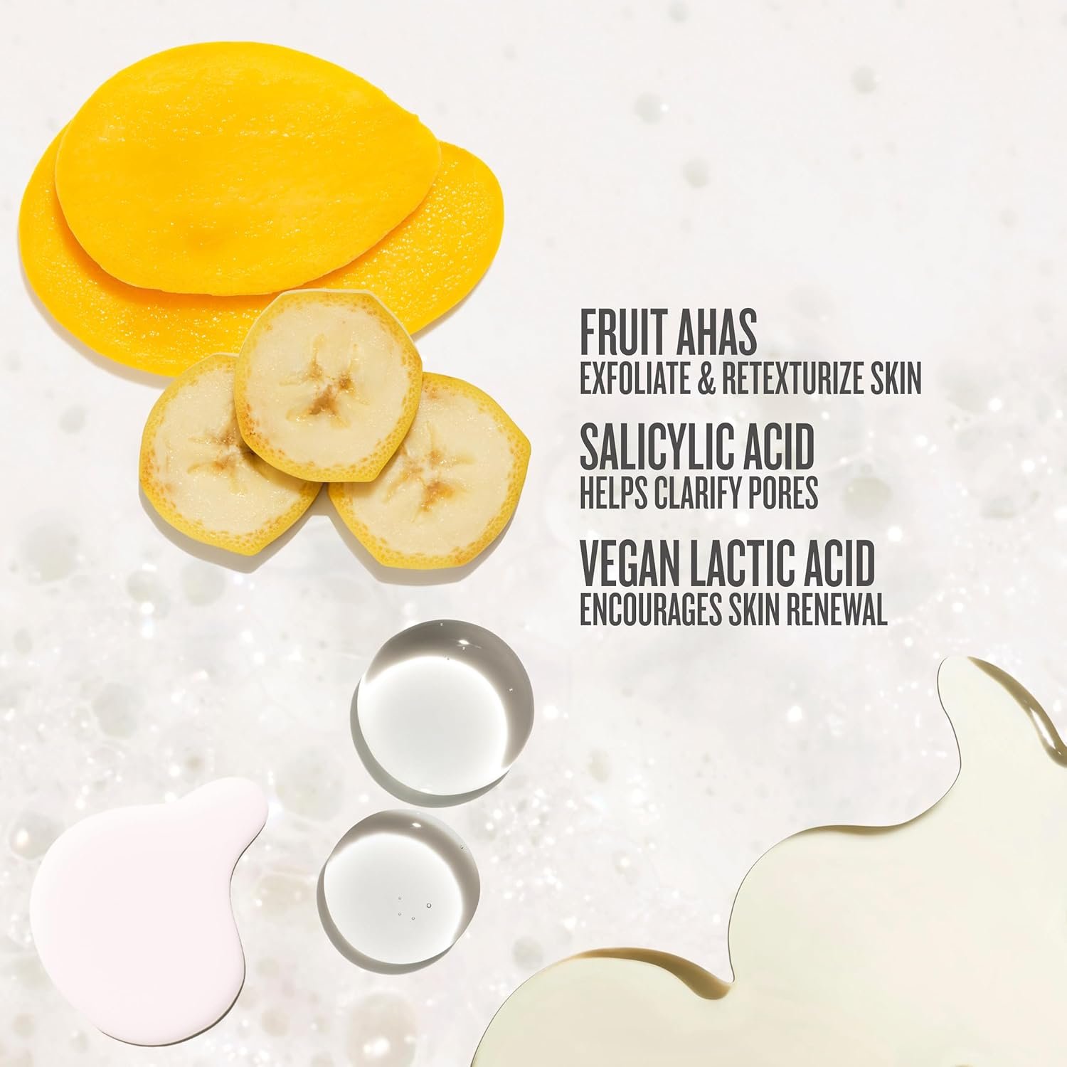 AHA de frutas (mango y banana): favorecen la renovación celular y aportan luminosidad.