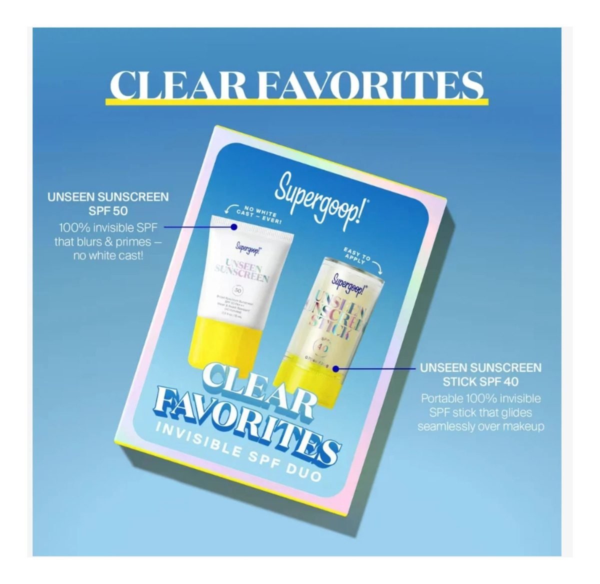 Supergoop! Clear Favorites Invisible SPF Duo incluye dos elementos esenciales SPF 100 % invisibles para la protección solar diaria sin yeso blanco.