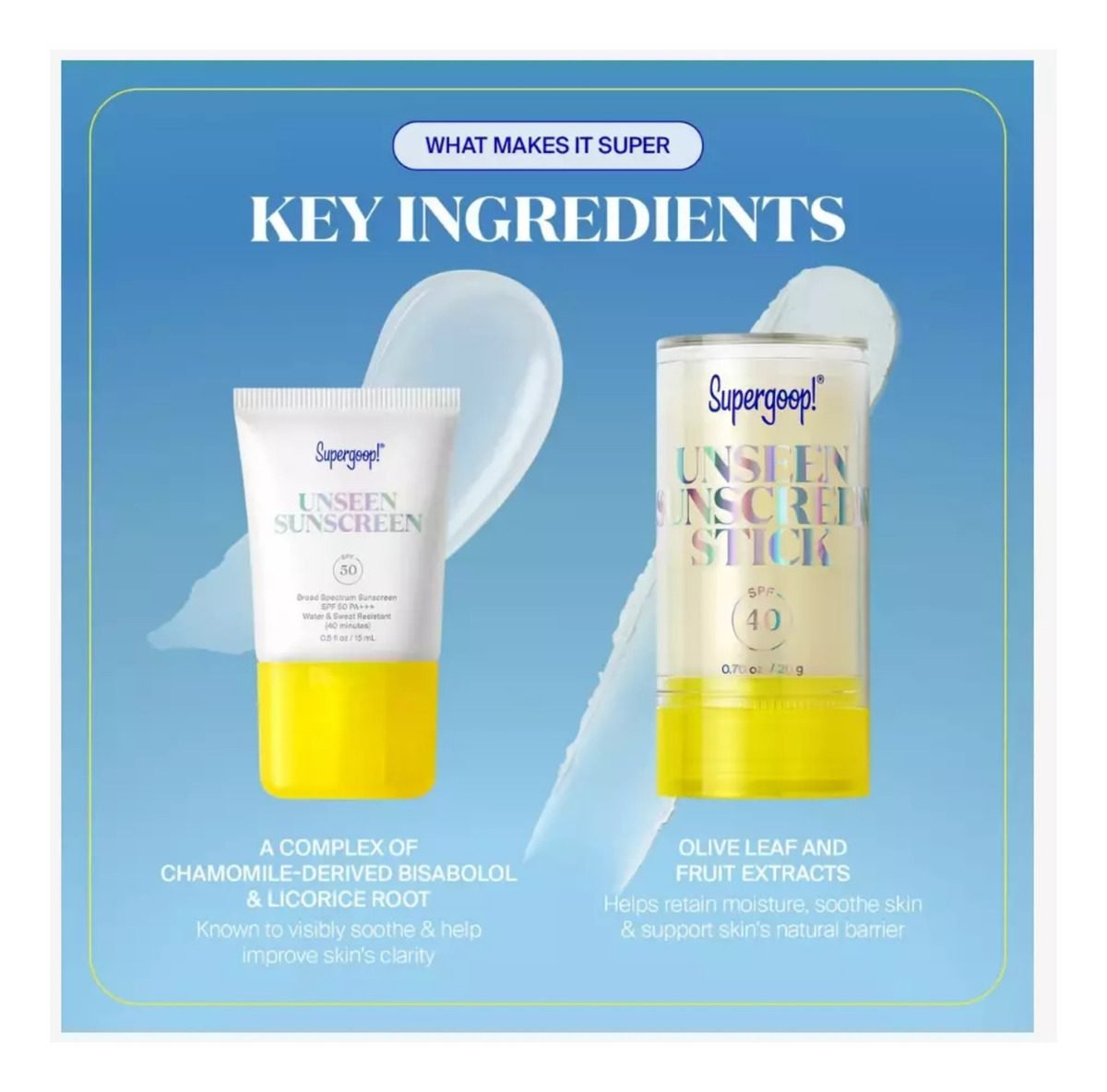 Unseen Sunscreen Stick SPF 40: Extractos de hoja de olivo y fruta Ayuda a retener la humedad, calmar la piel y apoyar la barrera natural de la piel”