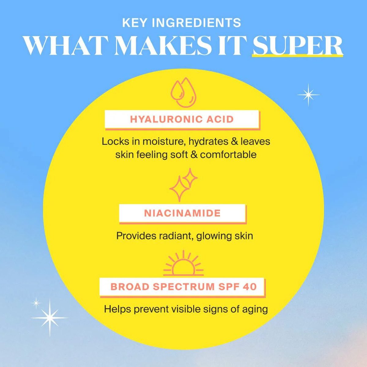 Este producto de belleza de culto le da a tu piel un brillo radiante, sin los daños del sol. Glowscreen ofrece protección experta y potentes ingredientes como ácido hialurónico y niacinamida para imitar la cálida luminosidad que tu piel obtiene al estar expuesta al sol y mantenerla radiante todo el año.